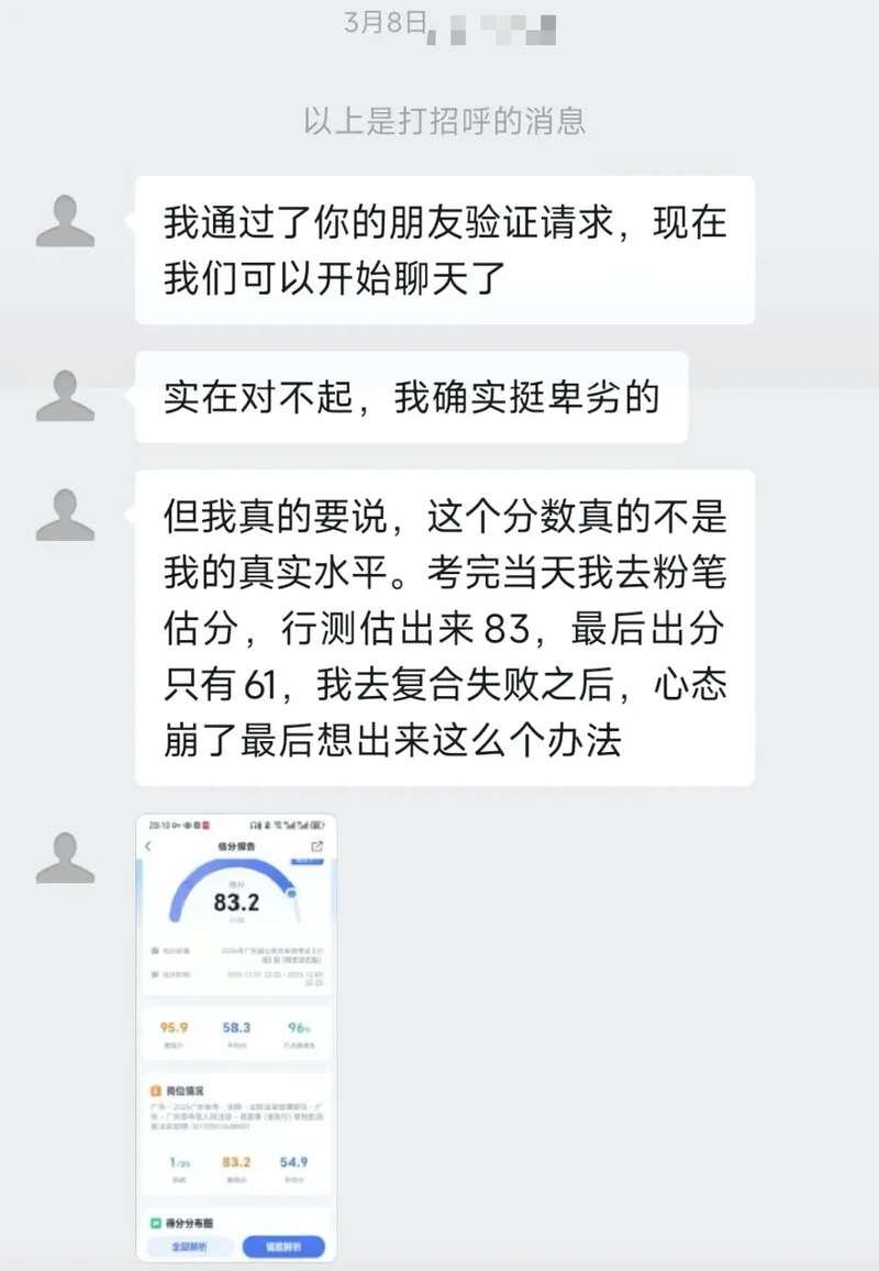 2026年广东省公务员考试笔试成绩发布后,某网友自称岗位笔试第一,还发出了自己79.7分的“成绩单”。另一名报考同岗位的考生李明(化名)看到后,发现自己在面试环节需要高出对方15分左右才能反超,因此改变了备考计划。然而,直到入围体检的人选揭晓,李明才发现,对方笔试成绩只比自己高0.05分。