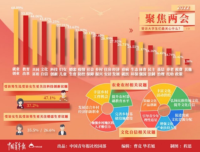 中青校媒调查显示,就业创业(68.89%)、教育改革(53.83%)、共同富裕(44.06%)是受访大学生最关注的3个议题。