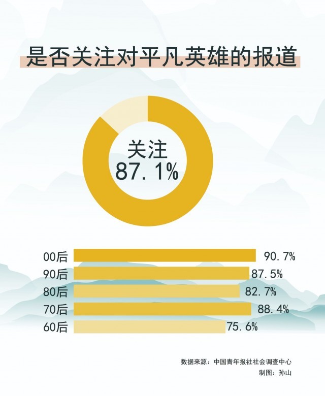 在生活中,很多平凡人用他们的使命担当,展现了平凡的伟大。在今年清明节,中国青年报社社会调查中心联合问卷网(wenjuan.com),对2048名受访者进行的一项调查显示,87.1%受访者平时会关注平凡英雄的报道,00后关注的比例更高(90.7%)。崇敬平凡英雄,64.9%受访者认为可以让年轻人学有榜样。