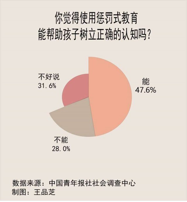 调查中,47.7%的受访家长觉得使用惩罚式教育,能帮助孩子树立正确的认知,20.8%的受访家长觉得不能,31.6%的受访家长表示不好说。
