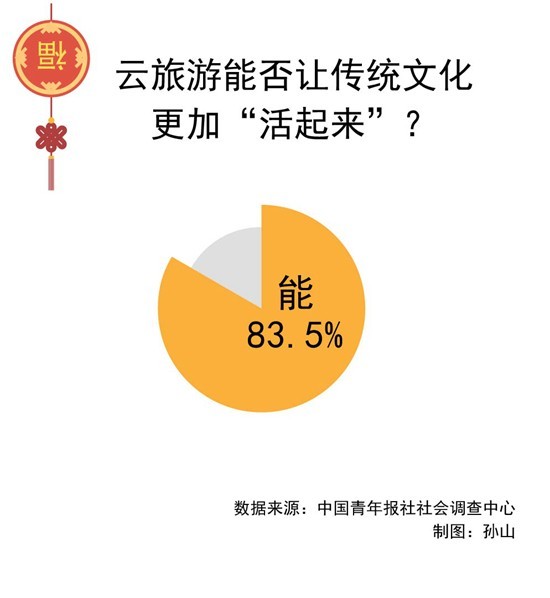 本周,中国青年报社社会调查中心联合问卷网(wenjuan.com),对2085名受访者进行的一项调查显示,83.5%的受访者认为云旅游可以让传统文化更加“活起来”。优秀传统文化是受访者最期待在云旅游中看到的文化元素。94.6%的受访者表示如果在云旅游中融入文化元素,会对自己更有吸引力。