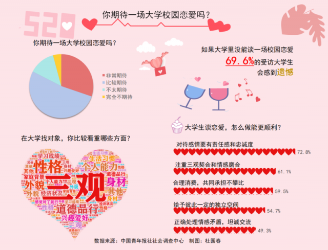上周,中国青年报社社会调查中心联合问卷网(wenjuan.com)对2011名在校大学生进行的一项调查显示,在大学校园里找对象,三观、性格和道德品行是最受重视的方面。若没能谈一场校园恋爱,69.6%的受访大学生会感到遗憾。谈一场校园恋爱,68.0%的受访大学生认为能学会处理情感问题,更成熟。