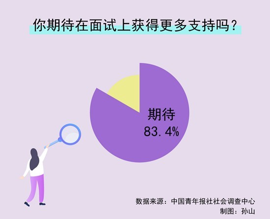近日,中国青年报社社会调查中心联合问卷网(wenjuan.com),对1521名受访者进行的一项调查显示,83.4%的受访者期待获得更多跟面试相关的帮助支持。64.1%的受访者希望学校可以有针对不同类型面试的指导,57.9%的受访者期待获得清晰的面试规则介绍。