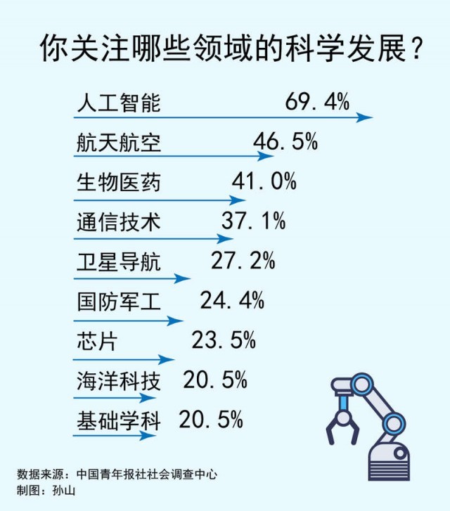 数据显示,人工智能(69.4%)是受访青少年最关注的科学领域。然后是航天航空(46.5%)、生物医药(41.0%)、通信技术(37.1%)。其他还有:卫星导航(27.2%)、国防军工(24.4%)、芯片(23.5%)、海洋科技(20.5%)、基础学科(20.5%)等。
