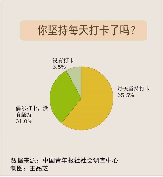 日前,中国青年报社社会调查中心联合问卷网(wenjuan.com),对2004名受访者进行的一项调查显示,65.3%的受访者每天坚持打卡,排在前两位的是健身运动(60.2%)和早起等生活习惯(60.1%)。76.5%的受访者觉得坚持打卡有必要,坚持下来收获很大。
