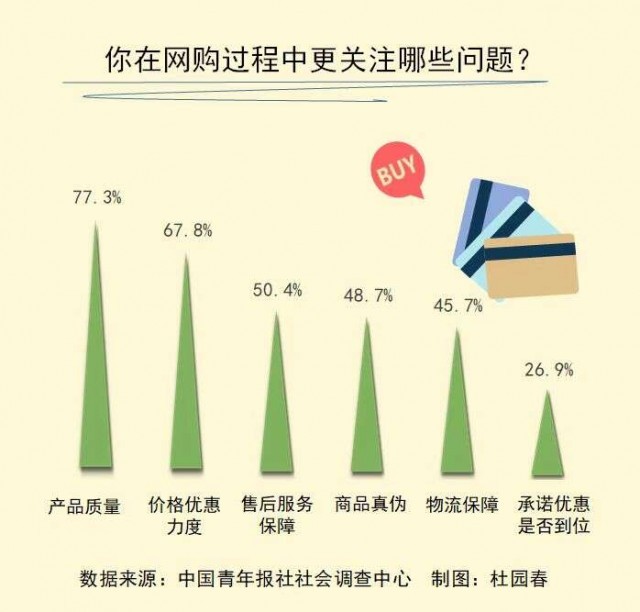 大家在网购过程中更关注哪些问题?数据显示,产品质量(77.3%)是受访者最为关心的问题,其次是价格优惠力度(67.8%)。其他还有:售后服务保障(50.4%)、商品真伪(48.7%)、物流保障(45.7%)。