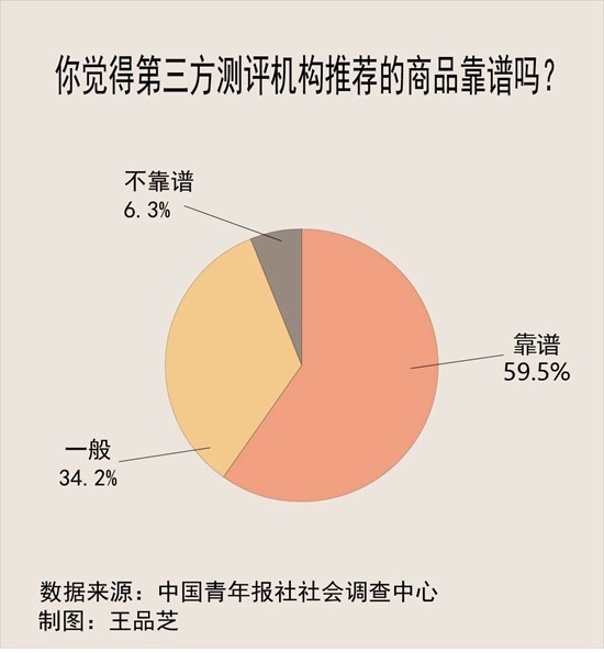 调查中,59.5%的受访者觉得第三方测评机构推荐的商品靠谱儿,34.2%的受访者觉得一般,6.3%的受访者觉得不靠谱儿。