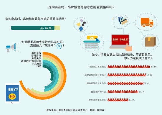上周,中国青年报社社会调查中心联合问卷网(wenjuan.com),对2005名受访者进行的一项调查显示,选购商品时,88.3%的受访者将品牌信誉作为重要考虑指标,坚决抵制失范品牌。71.5%的受访者对虚假宣传行为忍无可忍,直接拉入“黑名单”。69.8%的受访者感到如今消费者更加理性了,62.6%的受访者感到消费者权利意识提高了。