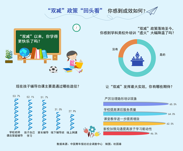 让“双减”发挥最大实效,65.5%的受访家长期待严厉治理隐形培训现象,64.0%的受访家长希望学校提高课后服务质量,62.5%的受访家长期待课堂教学进一步提质增效,46.3%的受访家长认为家校要加强沟通提高孩子学习能动性。