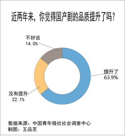 调查中,63.9%的受访者觉得近两年国产剧的品质提升了,22.1%的受访者觉得没有提升,14.0%的受访者表示不好说。