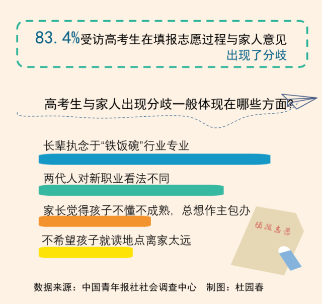 调查中,83.4%的受访高考生坦言,填报志愿过程中,与家人出现了意见分歧。