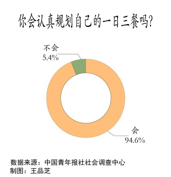 近日,中国青年报社社会调查中心联合问卷网(wenjuan.com),对1504名受访者进行的一项调查显示,94.6%的受访者会认真规划自己的一日三餐,其中33.4%的受访者每天都会。40.4%的受访者非常注重营养均衡、合理搭配。