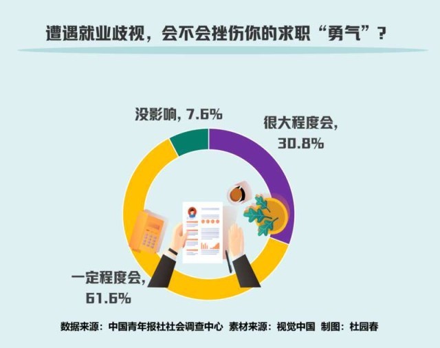 调查显示,若遭遇就业歧视,92.4%的受访大学生直言会挫伤求职勇气,超三成(30.8%)表示很大程度上会。