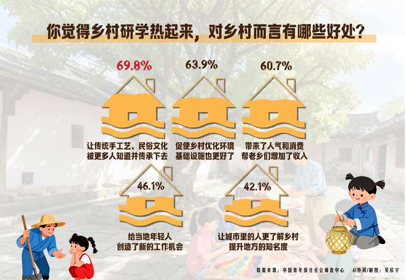 乡村研学“热”起来,也给乡村带来了许多生机。调查显示,69.8%的受访者认为乡村研学能让乡村传统手工艺、民俗文化被更多人知道并传承下去;63.9%的受访者认为能促使乡村优化环境,基础设施更好了;60.7%的受访者表示乡村研学给当地带来了人气和消费,帮老乡们增加了收入。其他还有:给当地年轻人创造了新的工作机会(46.1%)、让城市里的人更了解乡村,提升地方的知名度(42.1%)等。