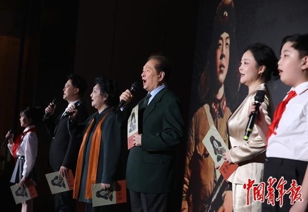 11月26日,北京,2025青年国潮品牌共创大会会场,现场启动首届“同颂中华·全国青少年志愿文学创作与诵读大赛”,艺术家瞿弦和(左四)、张筠英(左三)领诵《雷锋之歌》。中青报·中青网记者 陈 剑/摄