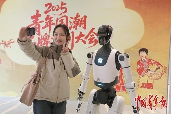 11月26日,北京,2025青年国潮品牌共创大会会场外,一位年轻人同一台人形智能机器人合影留念。 中青报·中青网记者 陈 剑/摄
