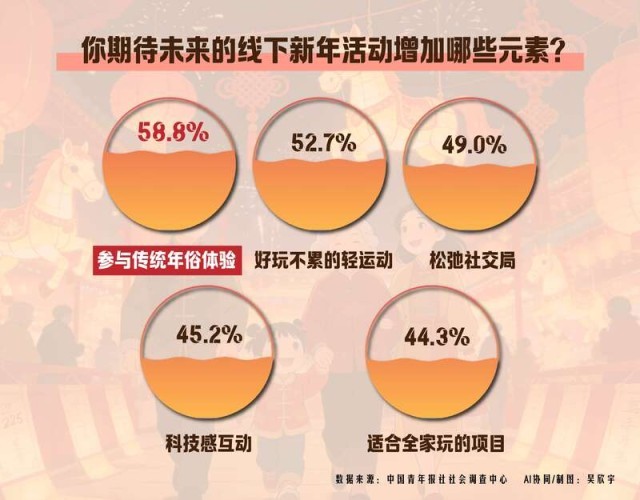 吸引更多人走到线下欢度春节,受访者期待未来线下新年活动增加哪些元素?数据显示,58.8%的受访者期待有更多传统年俗体验,如亲手写福字、做灯笼、体验非遗;52.7%的受访者希望有好玩不累的轻运动,如户外徒步、飞盘;49.0%的受访者希望有松弛社交局,如主题茶会、围炉煮茶、小众电影沙龙。其他还有:科技感互动,如AR合影打卡、沉浸式光影秀、互动游戏(45.2%);适合全家玩的项目,如亲子手工、怀旧游戏、萌宠互动(44.3%);美食主题市集,如汇集各地特色年味儿小吃和新潮饮品(34.5%)等。