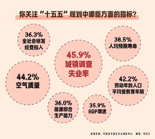 在“十五五”期间,受访者更关注哪些方面的指标?数据显示,城镇调查失业率(45.9%)、空气质量(44.2%)、劳动年龄人口平均受教育年限(42.2%)最受关注。其他还有:人均预期寿命(38.5%)、全社会研发经费投入(36.3%)、能源综合生产能力(36.0%)、GDP增速(35.9%)、粮食综合生产能力(34.5%)、碳排放强度(30.9%)等。