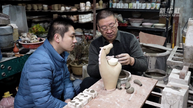 在山东省淄博市的博山油滴雨点釉研究所,“90后”青年周冠丞正专注地灌浆、修坯,父亲周祖毅在一旁悉心指导。