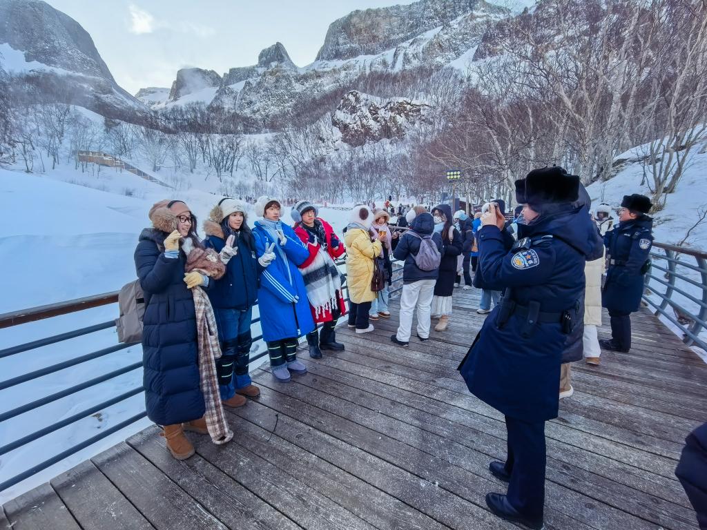 在长白山北景区,长白山公安局“冰凌花”女子警务队队员正在帮助游客拍照。新华社记者王帆 摄