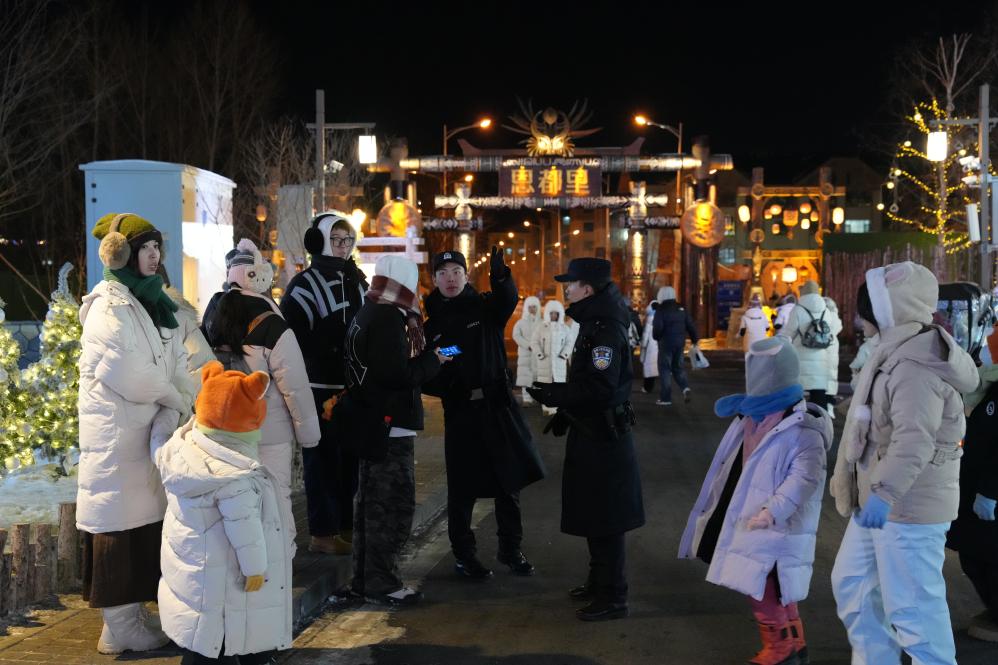 在位于长白山脚下二道白河小镇的恩都里商业街,民警正在为游客提供帮助。(受访者供图)