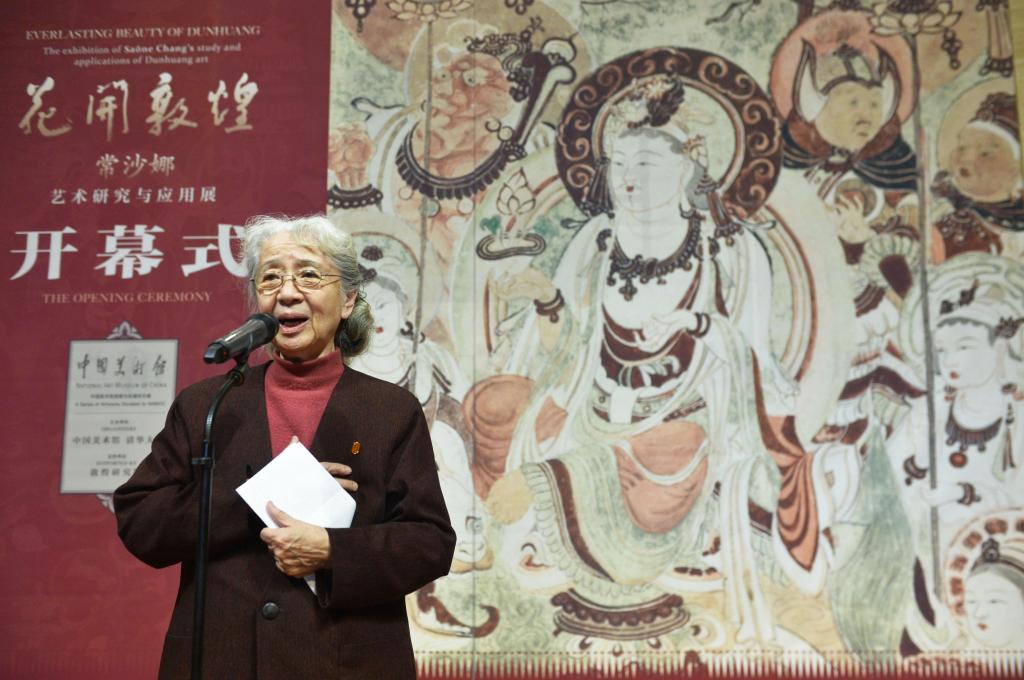 常沙娜在“花开敦煌——常沙娜艺术研究与应用展”开幕式上致辞。新华社记者 鲁鹏 摄